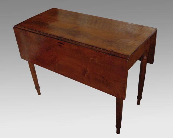 TIGER MAPLE SHERATON DROP LEAF TABLE: 2 board top, turned legs with pegged construction. Note: refinished and slight curve to drop leaf. 39'' wide, 19'' deep, 29'' tall