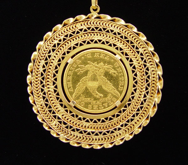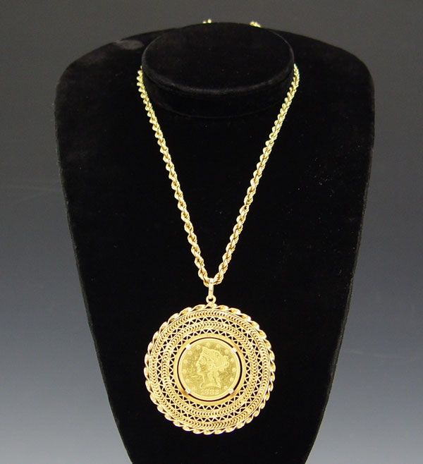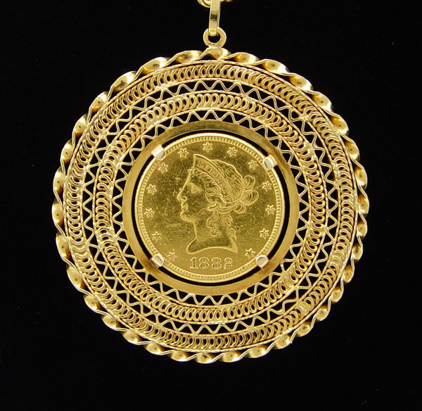 1882 GOLD COIN PENDANT SET IN 18K GOLD: 18K yellow gold coin frame contains one US 10 Dollar coin. 18K yellow gold 27'' hollow rope chain. 18K Weight: 33.5 grams