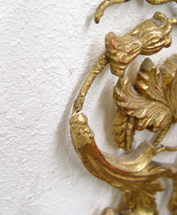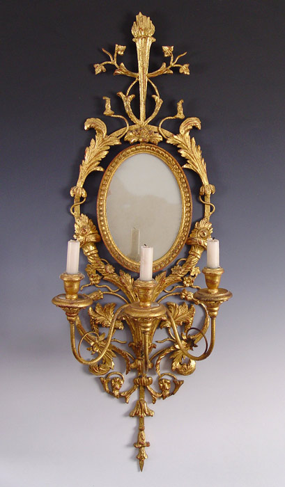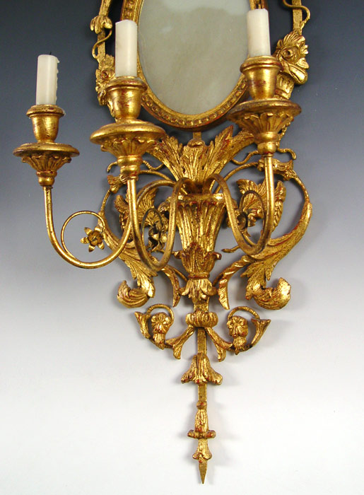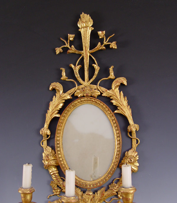 CHELSEA HOUSE GILT CARVED WOOD 3 LIGHT MIRROR SCONCE: Oval mirror, three candle sconce. ''Fine reproduction of historical art''. 38'' h x 13 1/2'' x 9 1/4''.