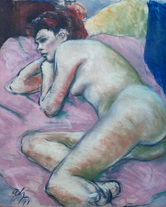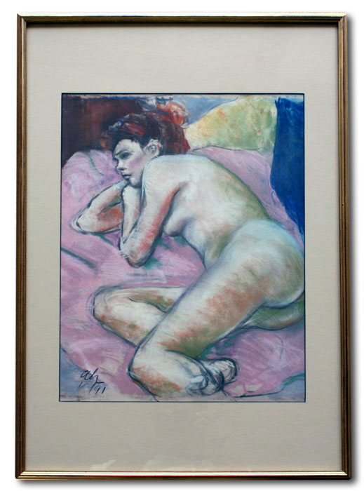 FEMALE NUDE PASTEL ILLEGIBLY SIGNED: 19 1/2'' x 15'', illegibly monogrammed AH?, dated '91, framed, 29 1/2'' x 21''.