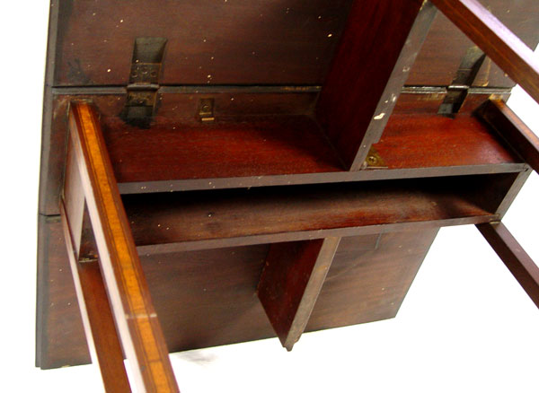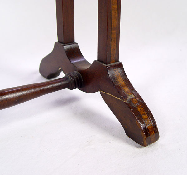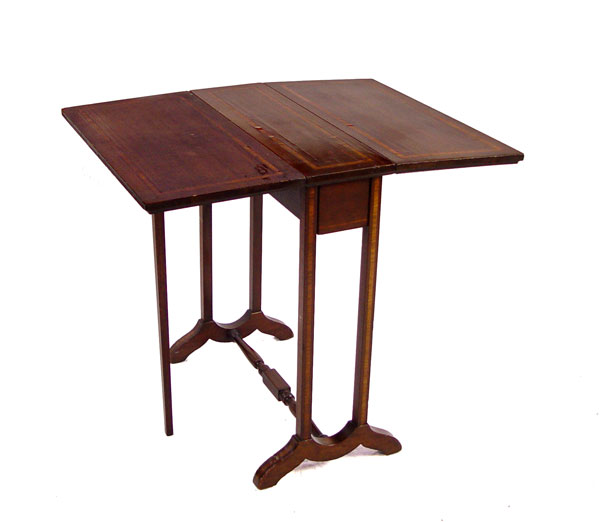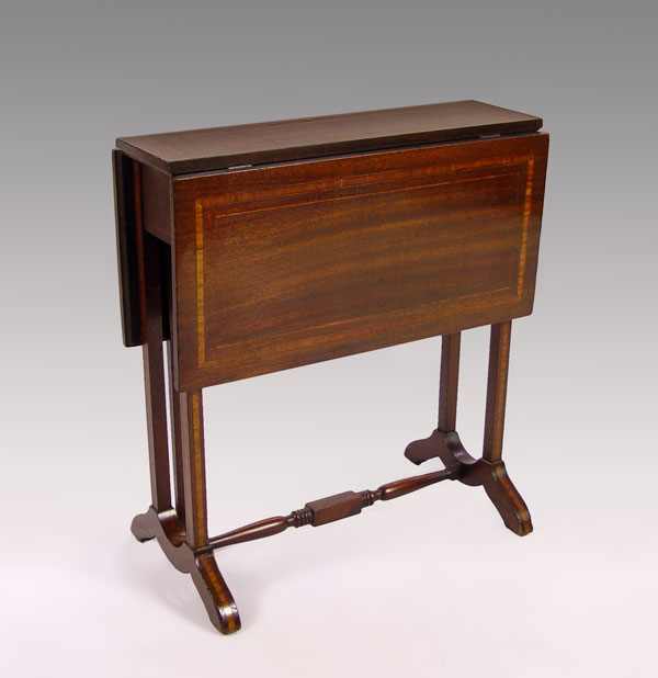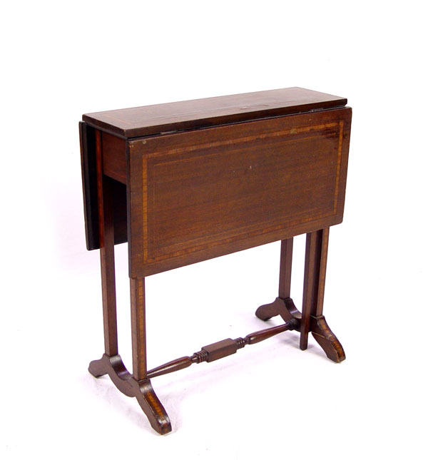 DIMINUTIVE BANDED MAHOGANY DROP LEAF SIDE TABLE: A mere 7'' wide x 22'' x 24'' tall, extends to 28'' long. Please note one leaf has veneer loss and alligator finish.