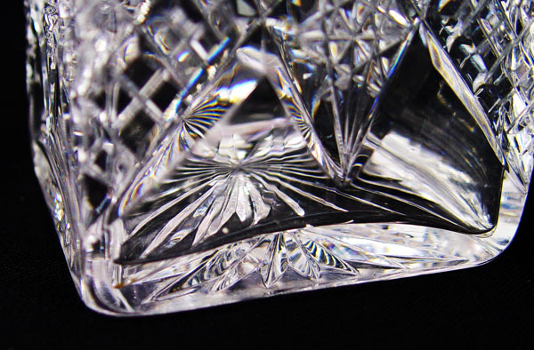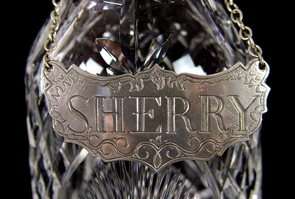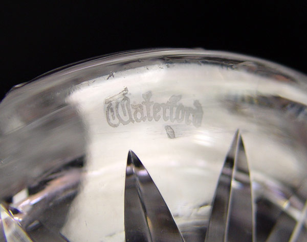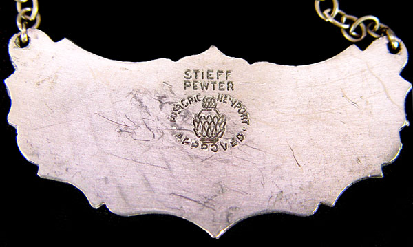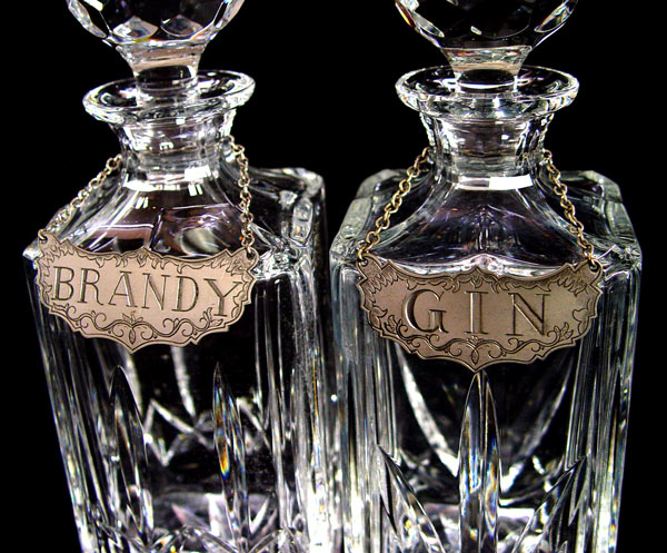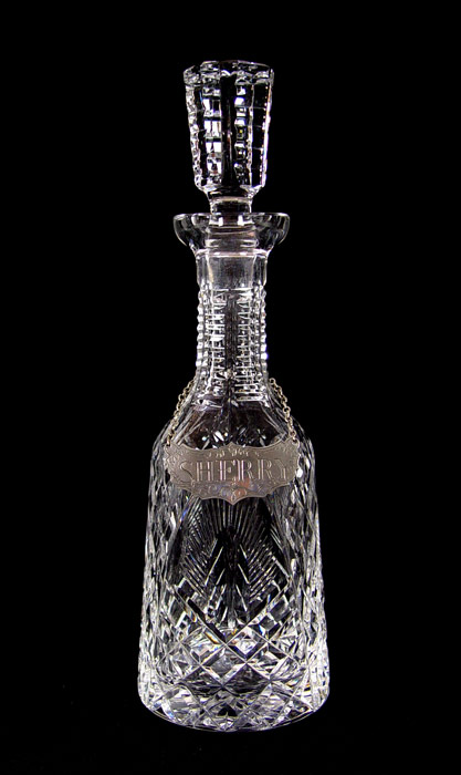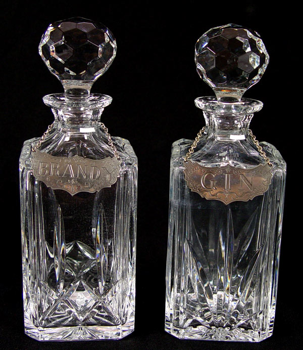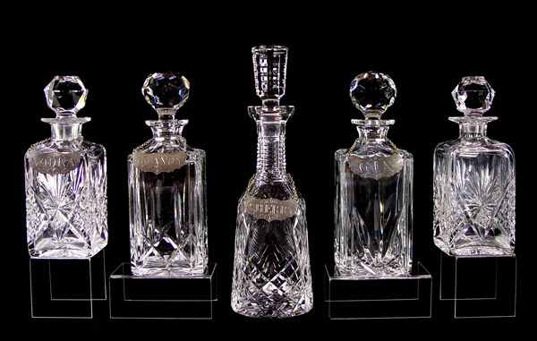 5 FINE CRYSTAL DECANTERS WITH LABELS: The tallest is signed Waterford. The 2 mid size are Atlantic. Accompanied by 4 Stieff Pewter labels. 9'' - 13 1/2''.