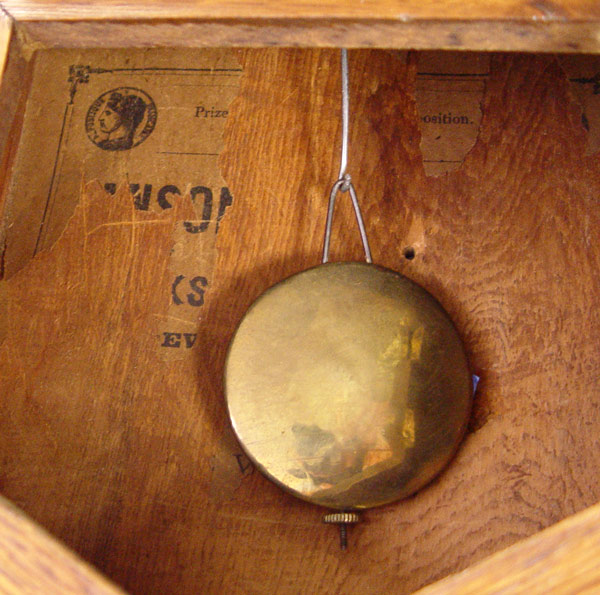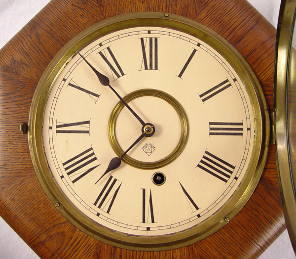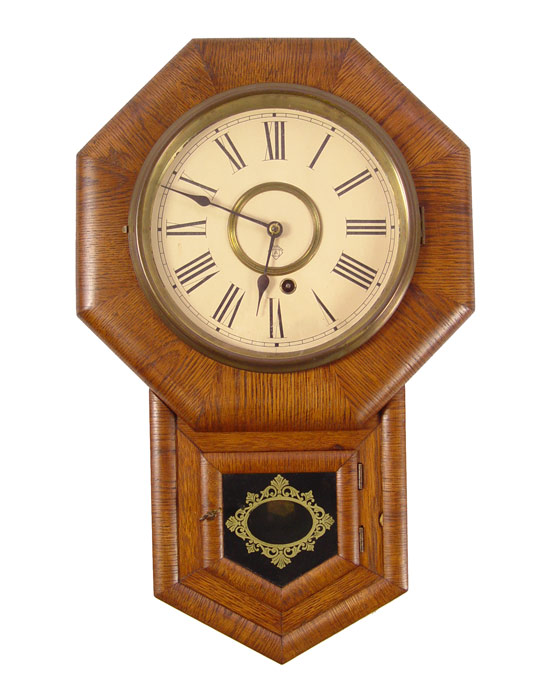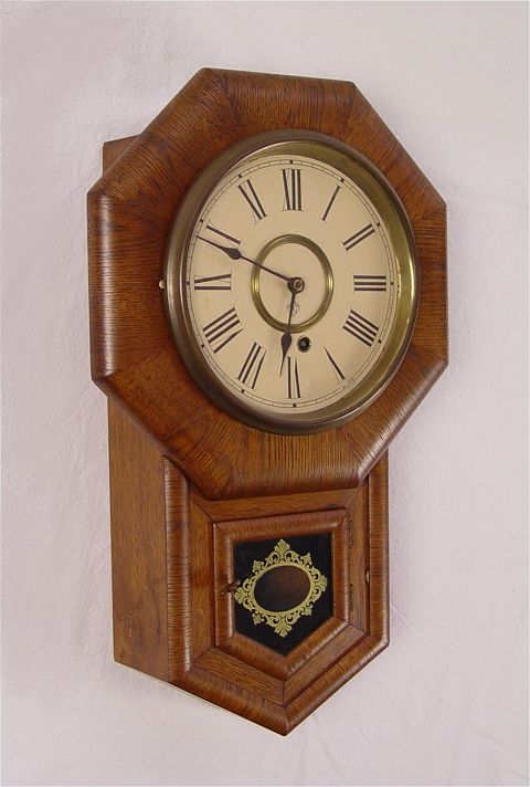 1901 ANSONIA SHORT DROP REGULATOR WALL CLOCK: Time only, no strike, 8 day with oak veneer case. Original hands and painted tablet on the bottom glass. The dial is perfect, traditional Ansonia mark. Key and pendulum movement. Ansonia produced clock from 1850-1929, when it went into receivership and assets sold to the Soviet Union. 19'' h. x 12'' x 5''.