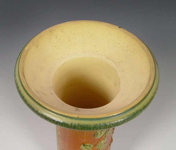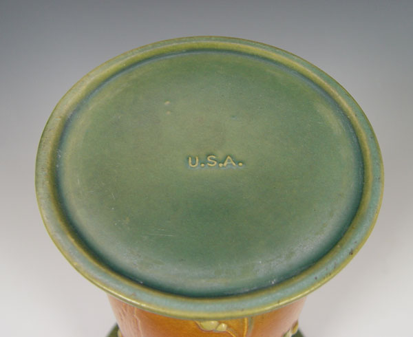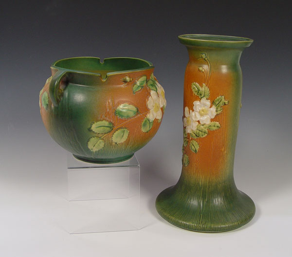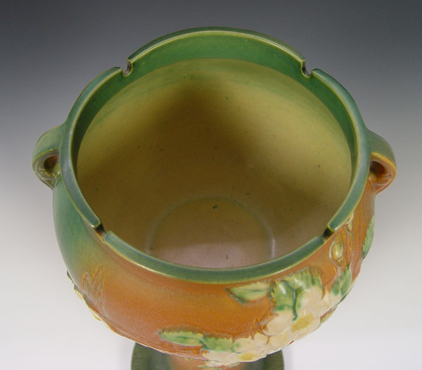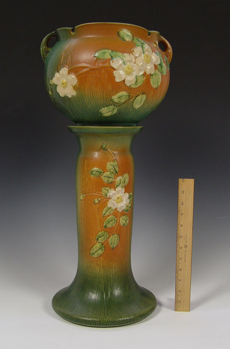 ROSEVILLE POTTERY ''WHITE ROSE'' JARDINIERE AND PEDESTAL: 8'' Jar, the pedestal is 16''.