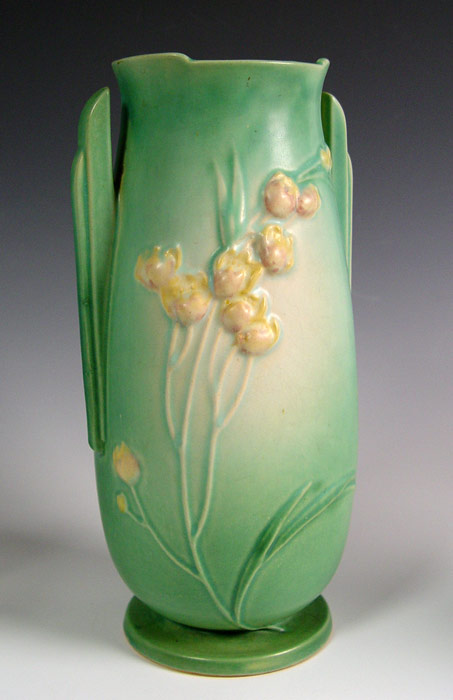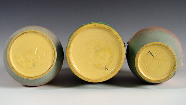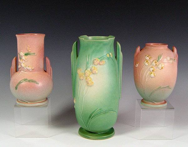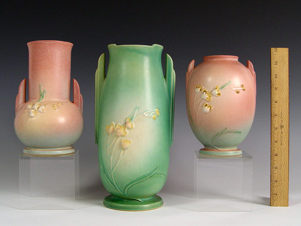 THREE ROSEVILLE POTTERY IXIA VASES: Green and pink, 7 - 8'' tall.