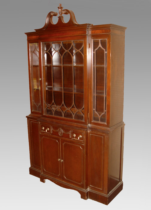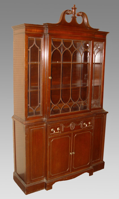 MAHOGANY CHINA CABINET: Diminutive one piece china cabinet with single glass door top, two fixed shelves, over single drawer, double door bottom, single fixed shelves, 79''h. x 44 1/2''w. x 16''d.