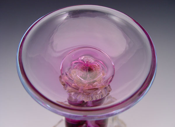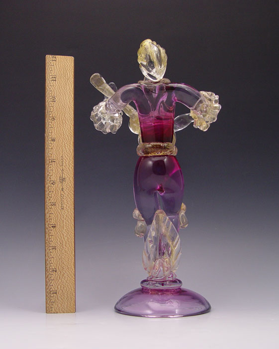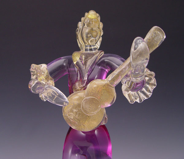 AVENTURINE VENETIAN ART GLASS FIGURE OF GUITAR PLAYER: Hues of pinks, purples and clear glass with aventurine accent pieces. Unmarked. Measures 12 1/2'' h. x 6 1/2''.