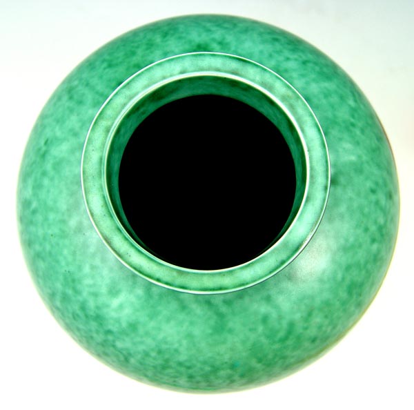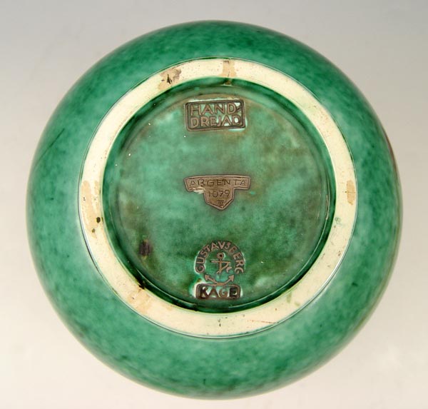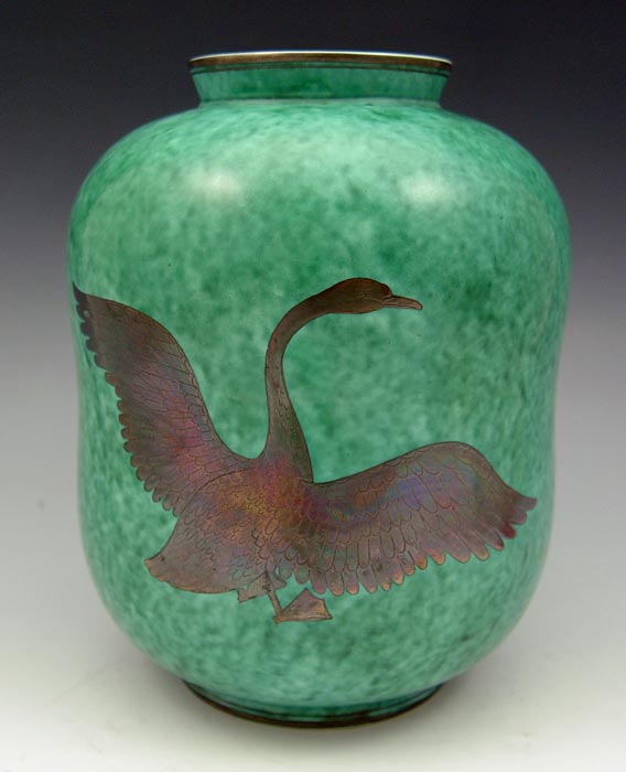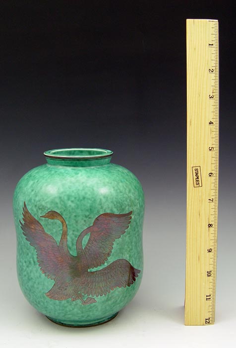 KAGE FOR GUSTAVSBERG ARGENTA SILVER OVERLAY VASE: Argenta vase designed by Wilhelm Kage for Gustavsberg. Silver overlay geese. 7''h.