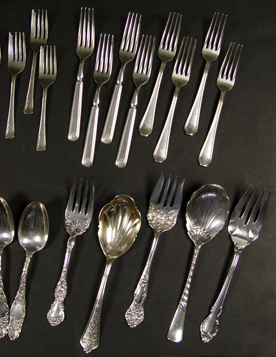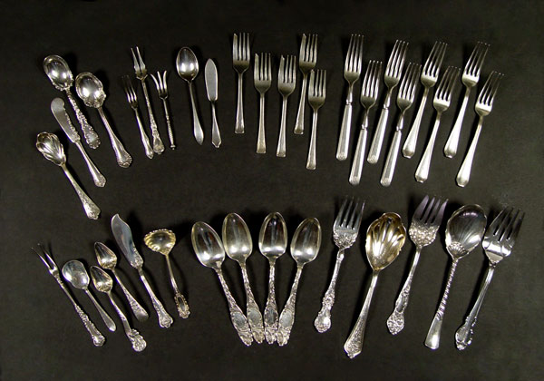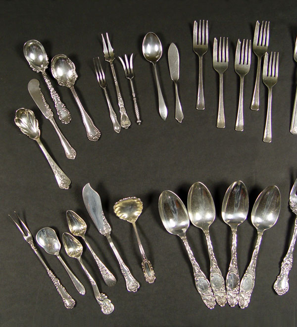 ESTATE COLLECTION OF STERLING & SILVERPLATE FLATWARE: Approx. 37 pieces, assorted patterns, makers. Highlights include Elkington, Gorham, Whiting, Towle and much more. Approx 24.3 troy oz. sterling.