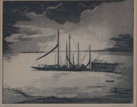 BLAKEMAN, Thomas, (American, 1887-): Harbor Scene, Etching and Aquatint, 7 1/2'' x 9 1/2'', pencil signed and numbered edition of 50, wooden frame, 14 1/2'' x 16 1/2'', mild acid burn in margins.
