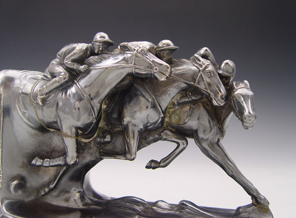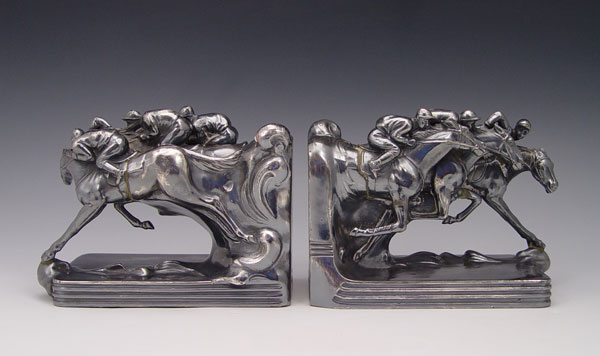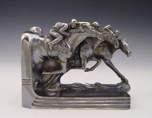 PAIR JENNINGS BROTHERS HORSE RACE BOOKENDS: Silvertone, Signed JB 809.