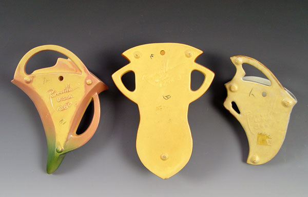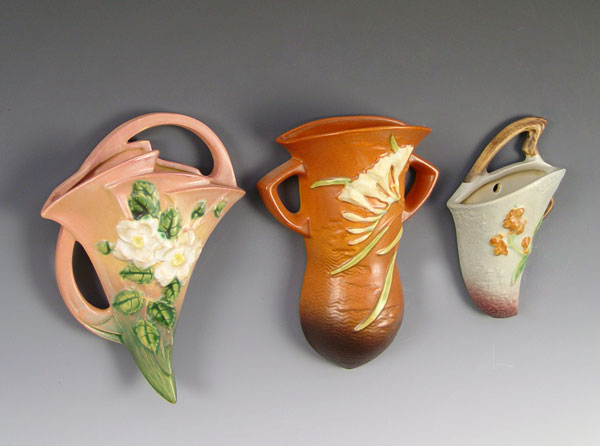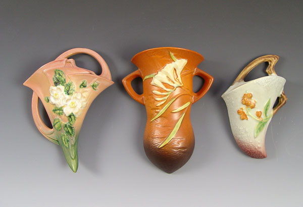 THREE ROSEVILLE POTTERY WALL POCKETS: White Rose, Freesia, and Bittersewwt, 7 - 8 1/2''l.