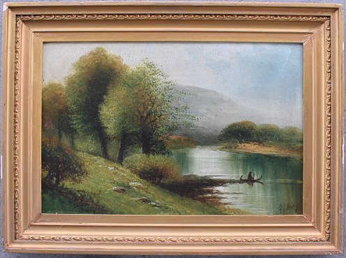 BERRY, Patrick Vincent, (American, 1852-1922): Man Paddling in a River Landscape, OIL/Canvas, 12'' x 18'', signed, gilded frame with overpaint and wear, 16 1/2'' x 22 1/2''.