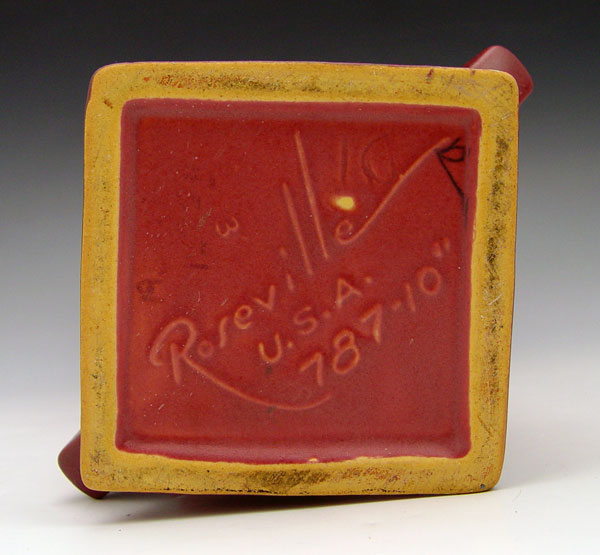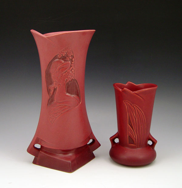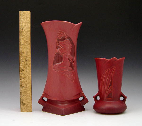 TWO ROSEVILLE POTTERY RED SILHOUETTE VASES: The Nude is 10'', the other is 6''.
