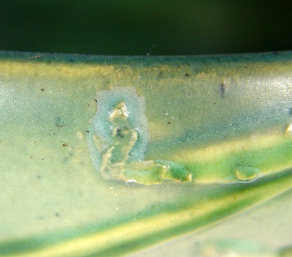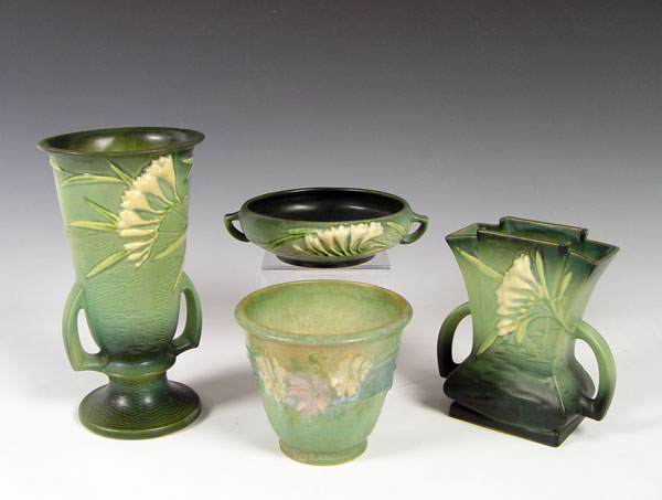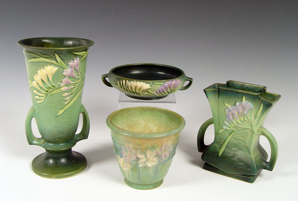 FOUR GREEN ROSEVILLE POTTERY VASES: 3 Fressia vases, and a flower pot. 6'' - 10''h.