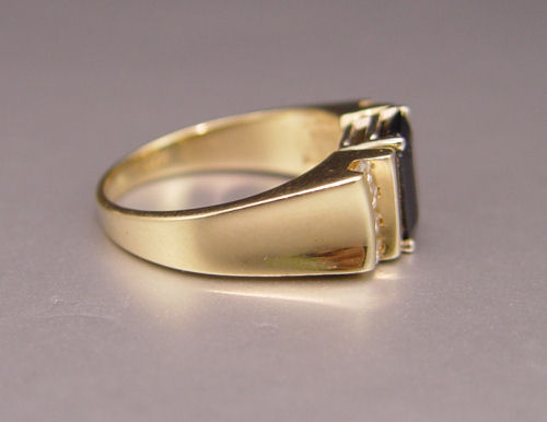 14K 2.50 CT. SAPPHIRE & .40 CTW. DIAMOND RING: 14K yellow gold ring contains one emerald cut sapphire. Weight: 2.50 Ct. Approx. The sapphire is rated VS in clarity (Type II), B in Hue, 7 in Tone and 3 in Saturation. Set with eight round brilliant cut diamonds. Weight: .40 Ct. Approx. The diamonds average VS in clarity and H-I in color. The sapphire is prong set. The diamonds are channel set. Weight: 7.6 grams. Size: 9