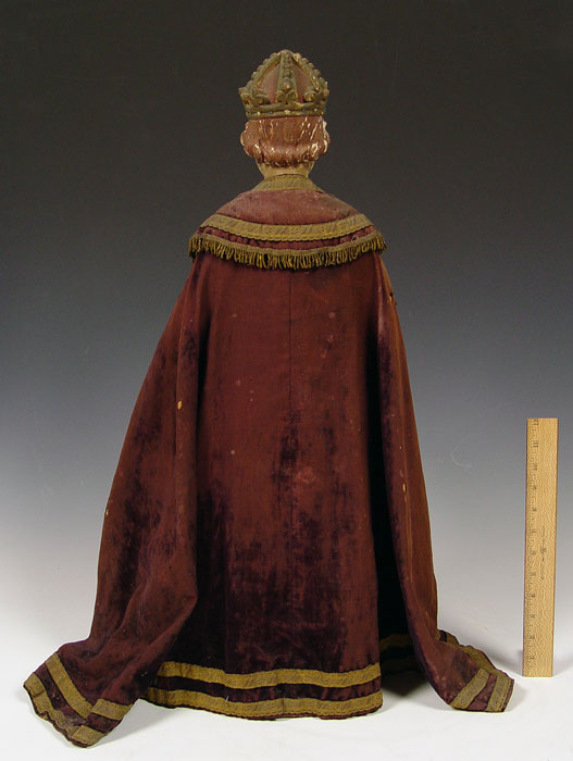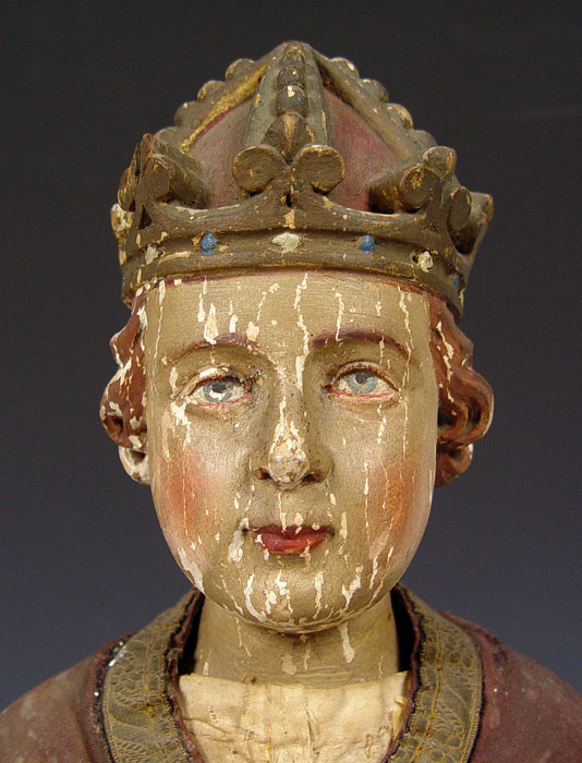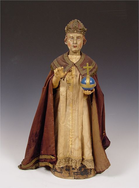 19th C CARVED RELIGIOUS STATUE INFANT PRAGUE: 26'' tall, original paint and fabric.