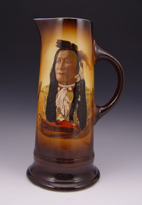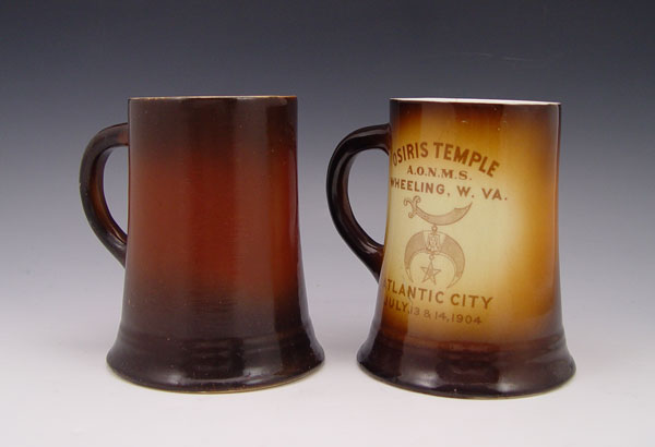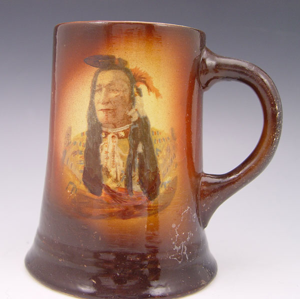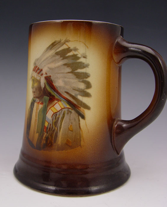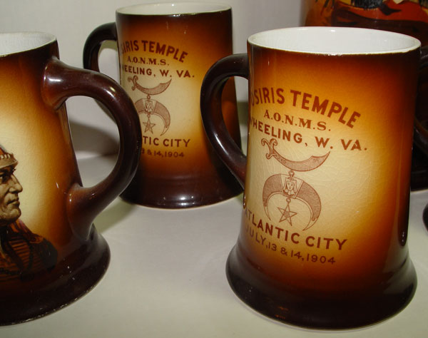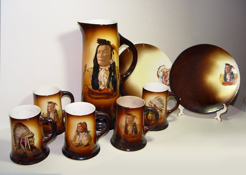 WARWICK IOGA NATIVE AMERICAN PORTRAIT TANKARD SET: Semi porcelain clay. The tall tankard is 12 3/4'', the 2 plates are 9 1/2''. Two of the mugs are special order for Osiris Shriners 1904.