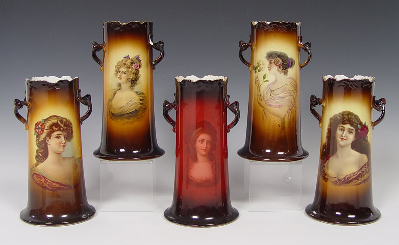 5 WARWICK CHINA IOGA PORTRAIT VASES: All beautiful women, semi-porcelain, 10 1/2'' tall.