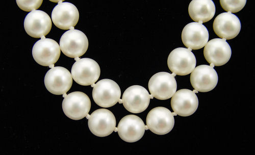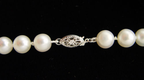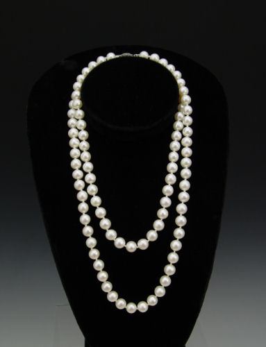 CULTURED PEARL STRAND NECKLACE: 35'' long single strand of pearls, approx. 8 8.5 mm. 14K white gold clasp.