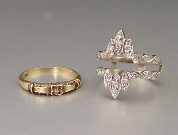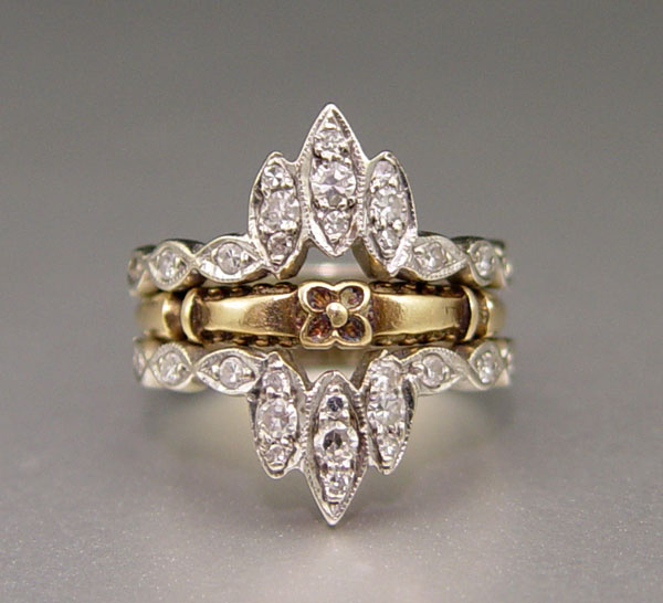 14K DIAMOND BRIDAL SET: 14K yellow gold Victorian ''promise'' ring in a 14 white gold insert ring contains twenty six round single cut diamonds. Weight: .50 Ct. Approx. The diamonds average VS in clarity and H-I in color. The diamonds are prong set. Weight: 6.0 grams. Size: 6