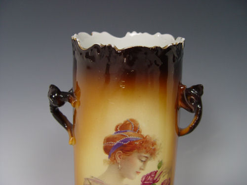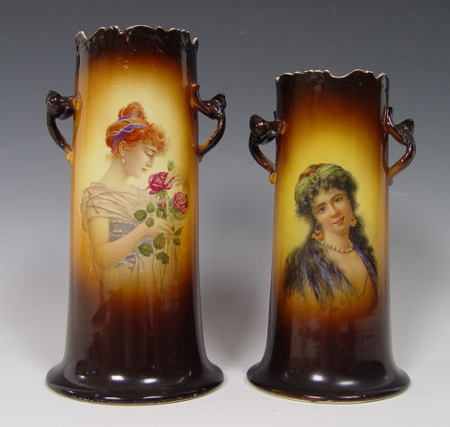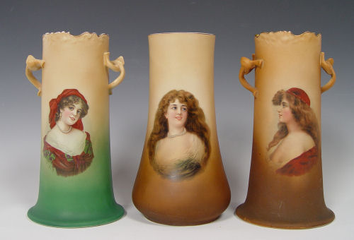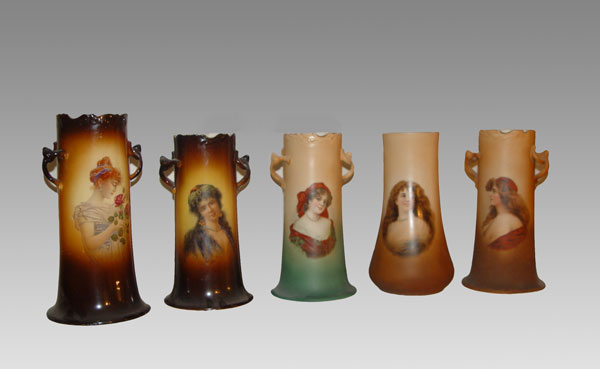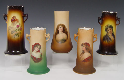 GROUP OF 5 WARWICK CHINA PORTRAIT VASES: Semi porcelain vases, each showing a portrait of a woman, including the gypsy and woman with roses. 10 -10 1/2'' tall.