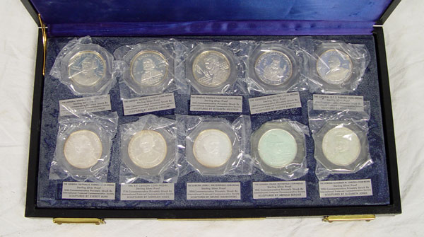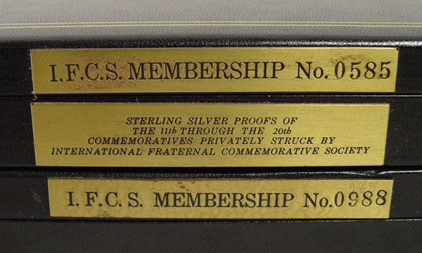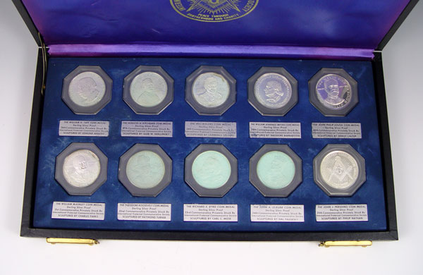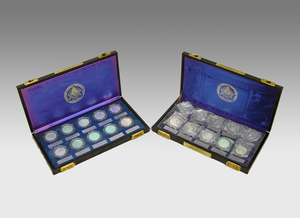 2 CASES MASONIC STERLING COMMEMORATIVE COINS: From the International Fraternal Commemorative Society. Each case holds 10 coins and includes proofs 11-20 and 21-30. Coins represent Generals, Presidents and other historical figures. Cases measures 1 1/2'' x 14 1/4'' x 7 1/2''.
