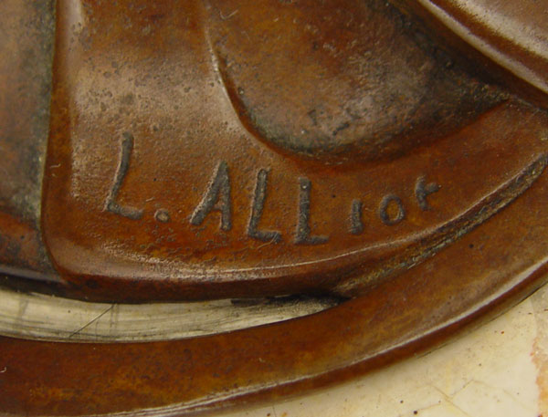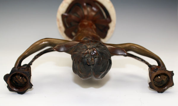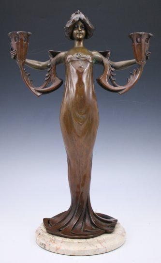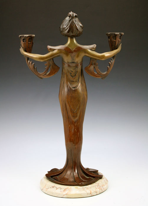 ALLIOT, Lucien Charles Edouard, (French, 1877-1967): Art Nouveau Figural Bronze Maiden 2 Light Candelabra, 16'' h., 10'' w., signed, affixed to beveled marble plinth.