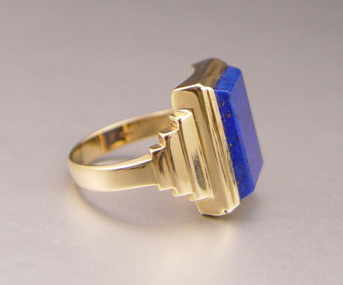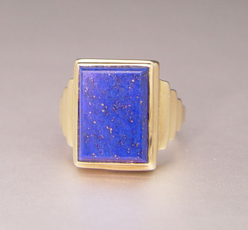 10K GENTS LAPIS RING: 10K yellow gold ring contains one 15.00 x 100.00 mm rectangle lapis tablet. The tablet is bezel and epoxy set. Weight: 7.0 grams. Size: 9.5