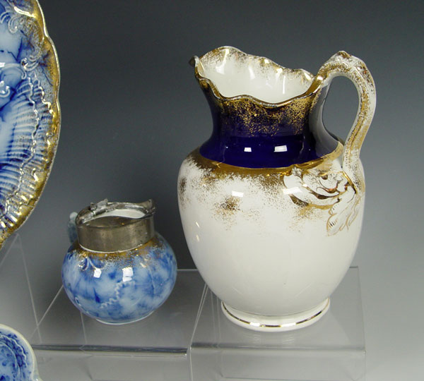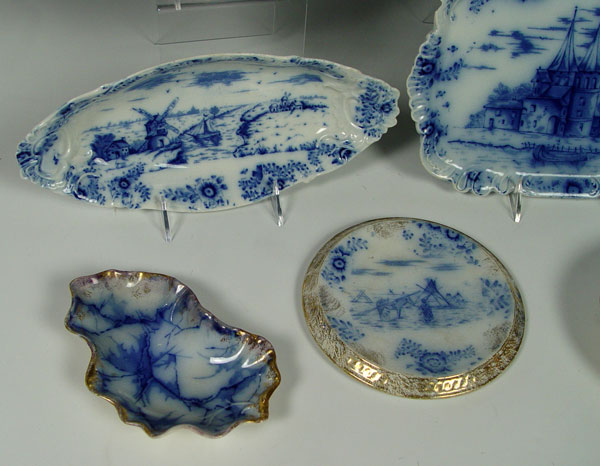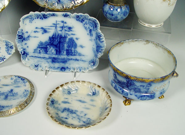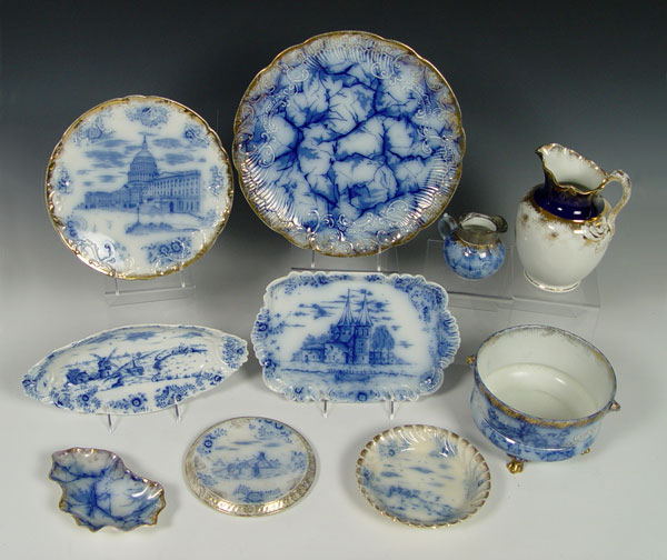 WARWICK CHINA FLOW BLUE: Approx. 10 pieces ot include a footed jardiniere, 12 3/4'' charger, bone dish, Delft pattern relish dish, a plate with the image of the nations capital, a trivet with image of plains Indians, an 11'' tray, 8'' jug, and syrup pitcher with no lid.