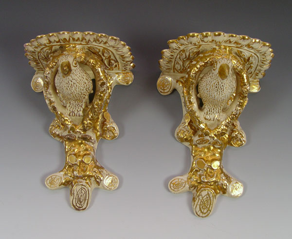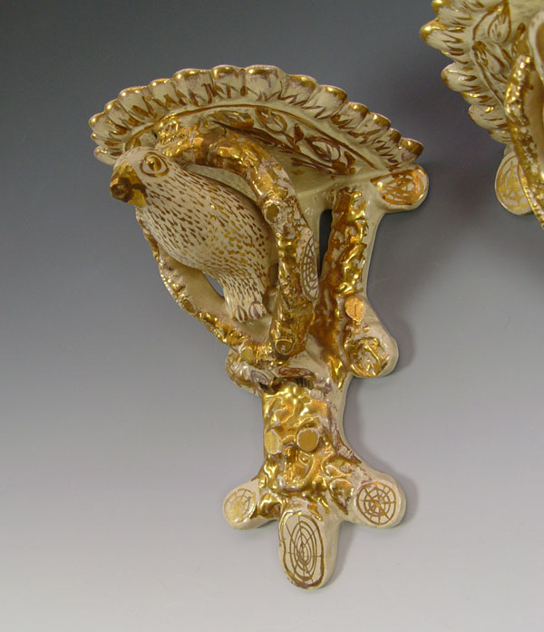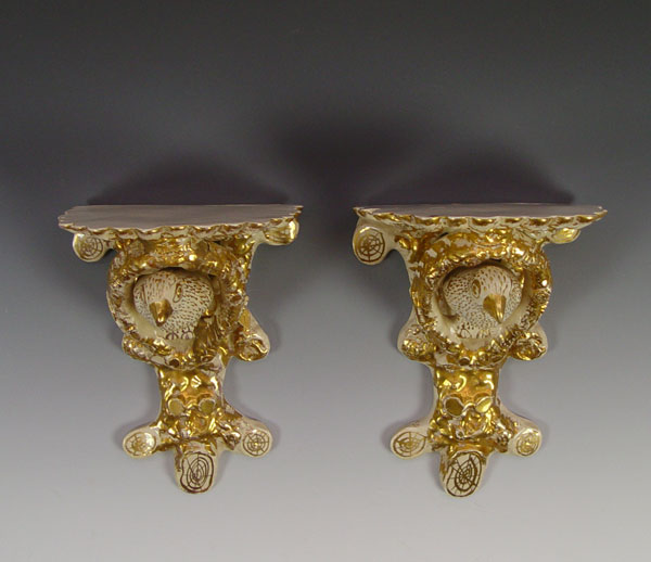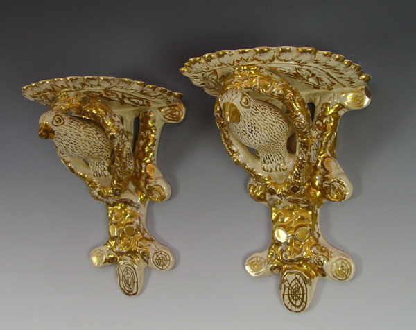 PAIR PARCEL GILT FIGURAL BIRD WALL BRACKETS: Yellow ware? shelf brackets, 10 1/2''l. x 8'' x 7''. Please note old beak tip loss on one.