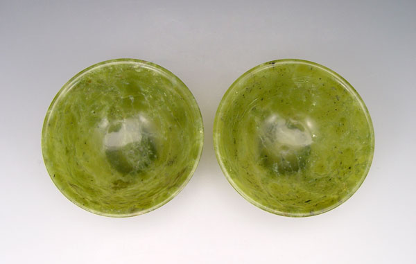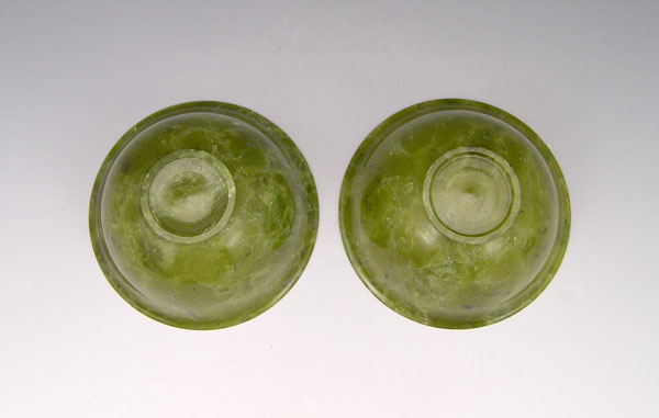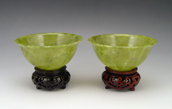 PAIR CHINESE MOTTLED GREEN OLIVINE BOWLS: Matched pair, lipped, polished. 4'' dia. Accompanied with the wood stands.