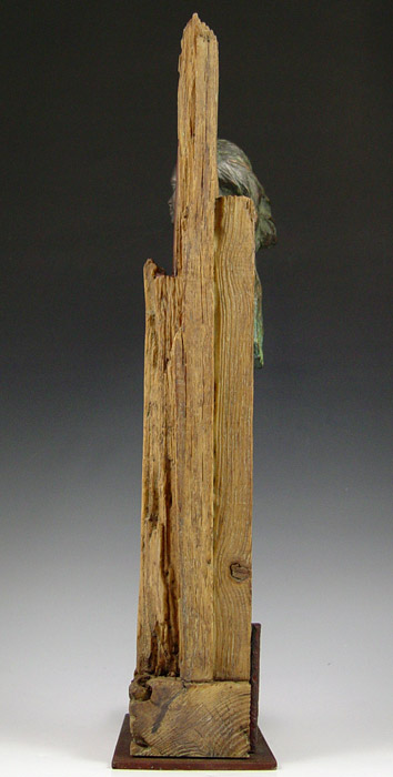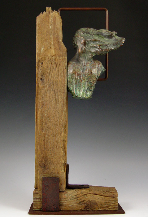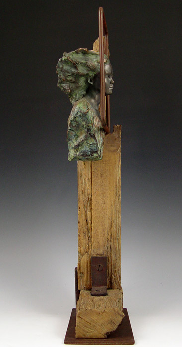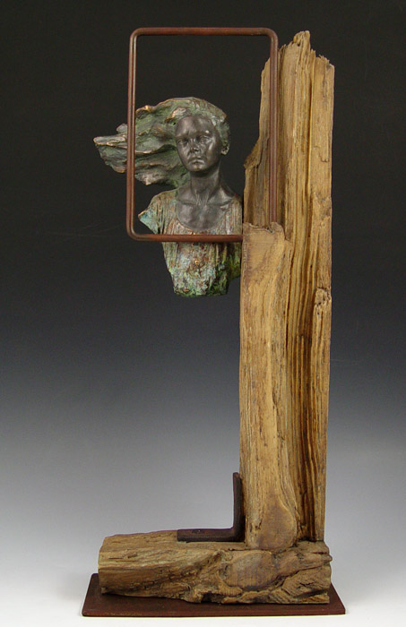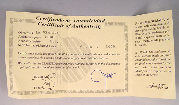 MIXED MEDIA SCULPTURE OF WOMAN: ''La Ventana'', Mounted with metal on wood, 18'' h., Bronze measures 7'', Inverart COA, signed Miro, dated 1984, numbered 241/3999.