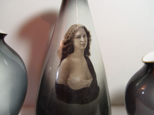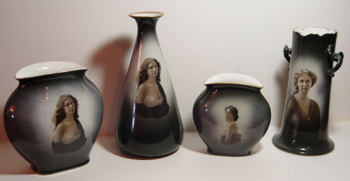 4 WARWICK CHINA PORTRAIT VASES: Two with the Wheeling Girl Lady of the Evening. Charcoal gray glaze. Approx. 7 - 10''h.