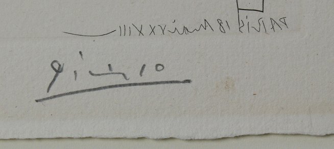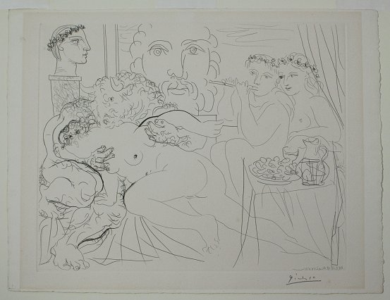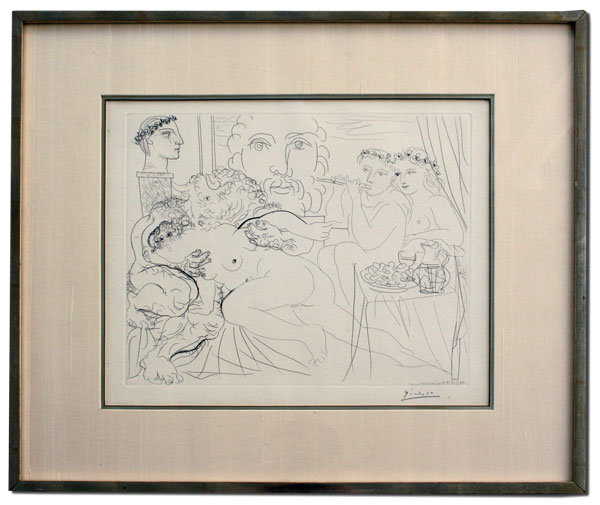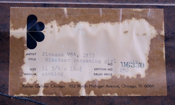 PICASSO, Pablo, (Spanish, 1881-1973): Minotaure Caressant Une Femme(from Vollard), Etching, sight size 13'' x 16'', 13 3/8'' x 17 1/2'' with margins, Picasso watermark in left margin, pencil signed, vintage silver gilded frame, 20 1/2'' x 24 1/4'', Kovler Gallery label verso, Chicago.