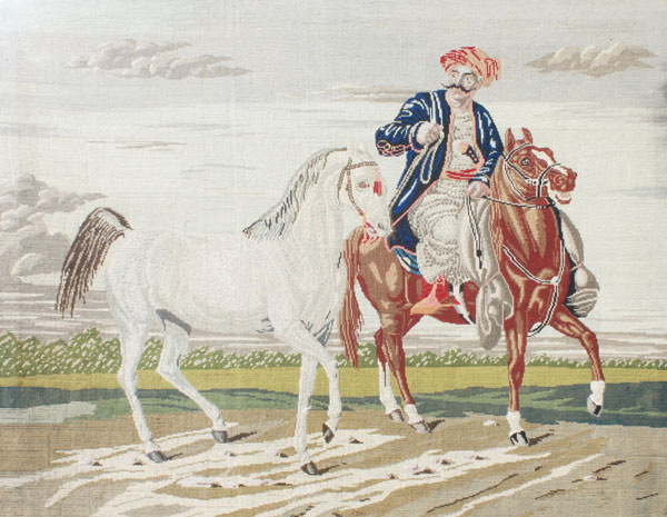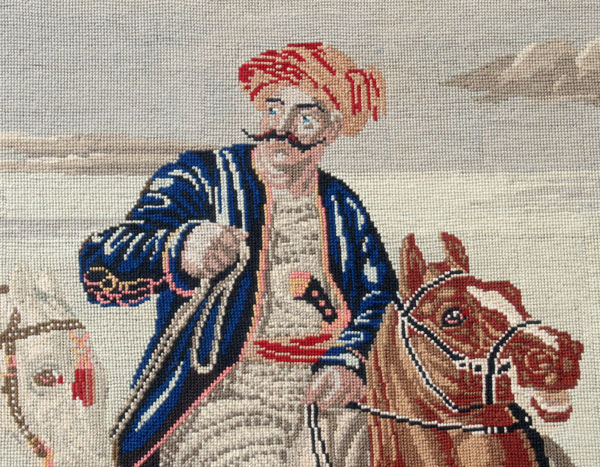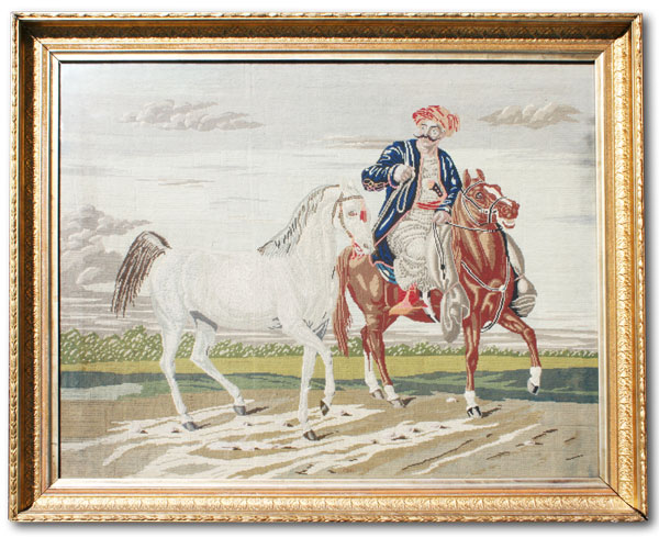 ORIENTALIST MOTIF PETIT POINT/TAPESTRY: Depicts an Arab Horse Trainer, 29 1/2'' x 37 1/2'' sight size, gilded gesso frame with overpaint and wear, 35'' x 43 1/2''.