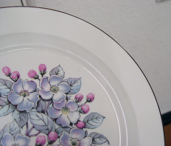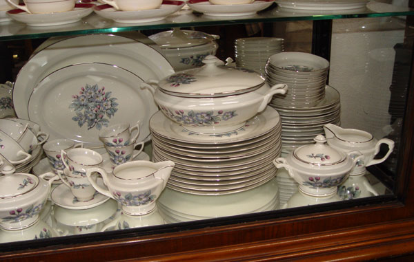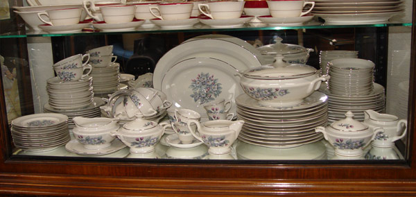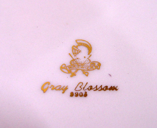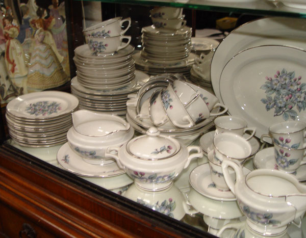 PLATINUM TRIM WARWICK CHINA IN THE GRAY BLOSSOM PATTERN: 91 pieces to include 12 each of dinner plates, soup bowls, bread plates, dessert bowls, cups and saucers. There are 10 soup bowls. Serving pieces are the 2 platters, covered vegetable, 2 open oval vegetable, 2 cream pitchers ad 2 sugar bowls.