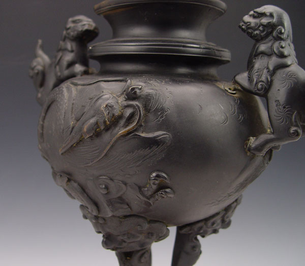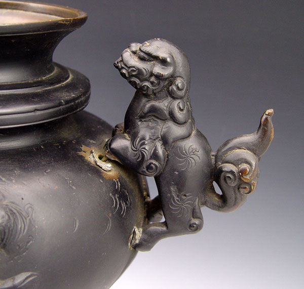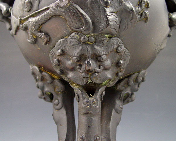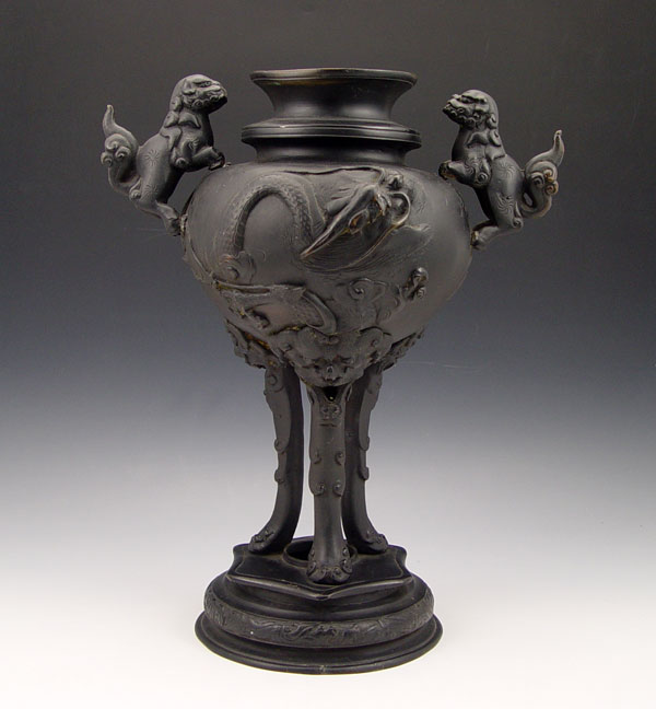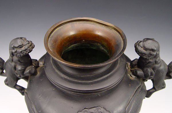 CHINESE BRONZE CENSOR: With foo dog figural handles, embossed dragon on the body. Mid to late 20th C. 16'' tall.