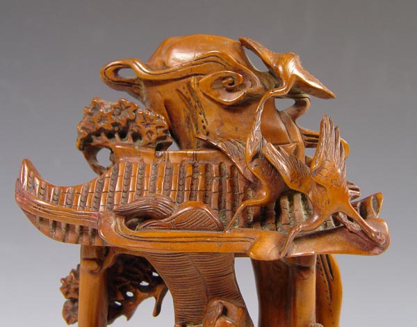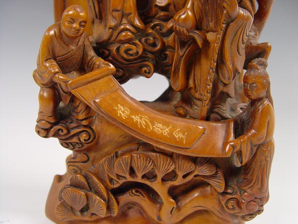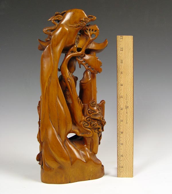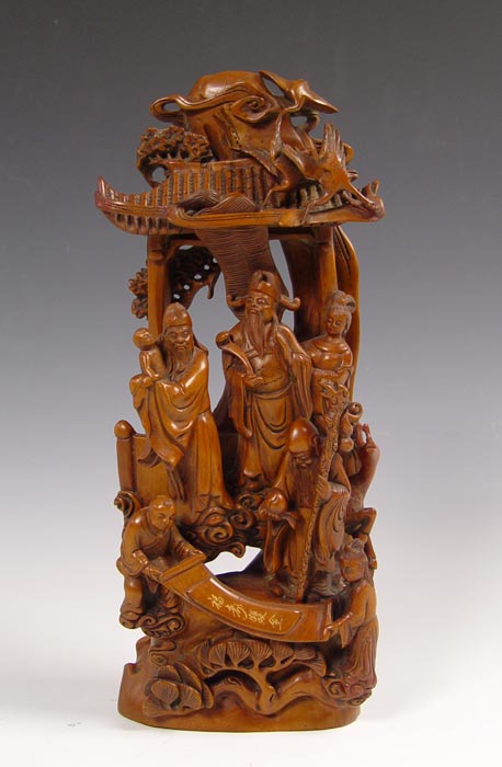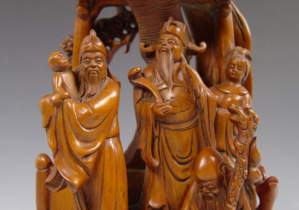 FINE CHINESE WOOD CARVING OF THE THREE STAR GODS: With symbols of good luck and a long life. 14 1/2''