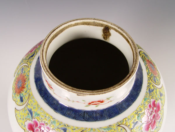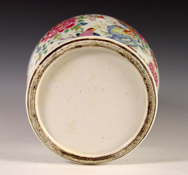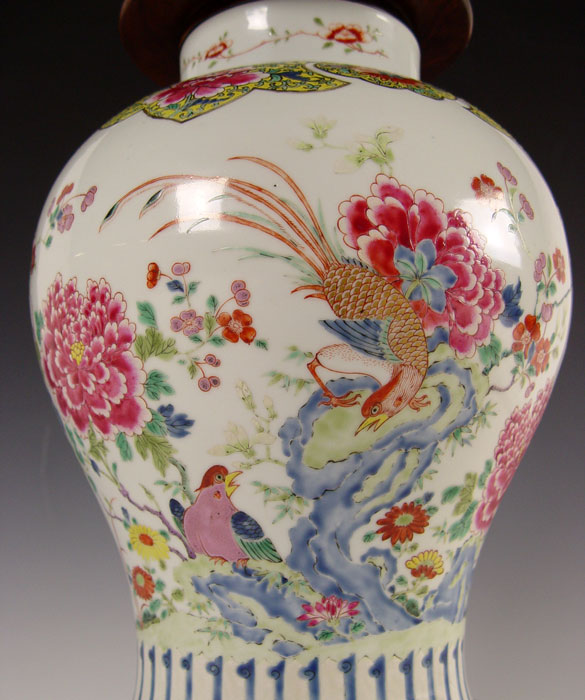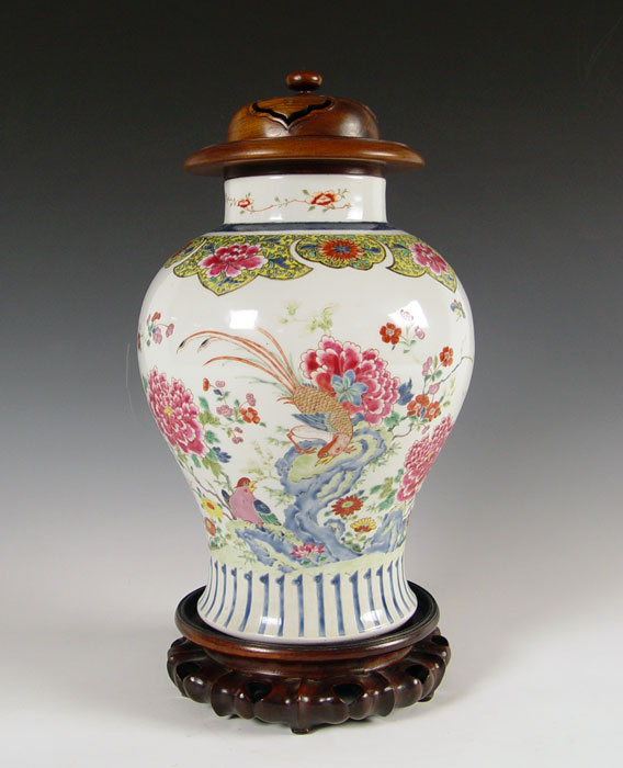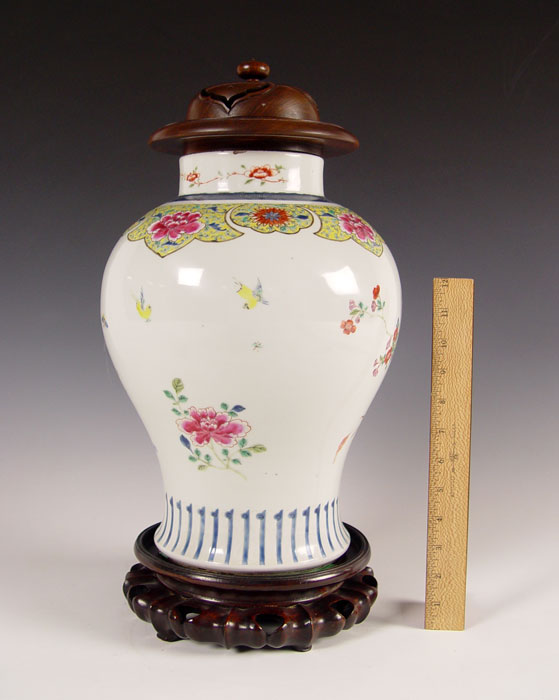19TH C CHINESE PORCELAIN COVERED BALUSTER VASE: Famille Rose type decoration, porcelain is 14''. With the wood carved stand and wood lid, 19'' tall.