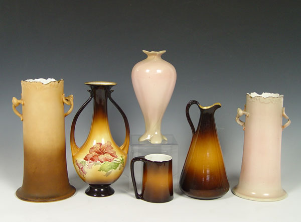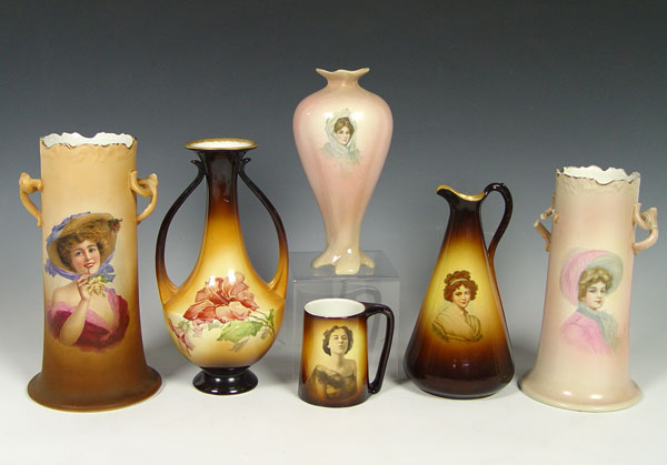 6 PIECE GROUP WARWICK CHINA VASES AND MUG: 4 lady portrait vases, a lady portrait mug and a hibiscus flower vase, 4 1/2'' - 12''h.