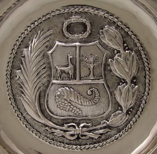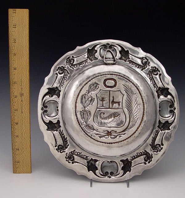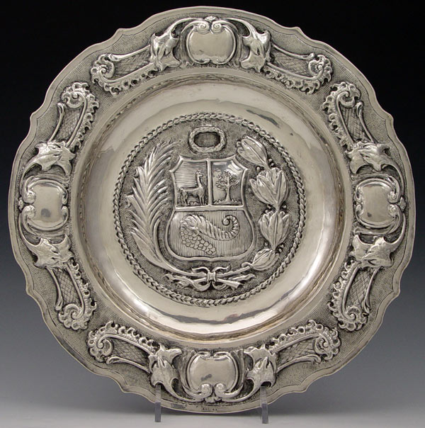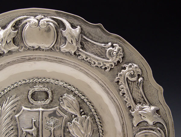 STERLING HERALDIC TRAY: Embossed design with heraldic crest featuring deer, tree and shell with grapes. Marked Adiz .925. Measures 10 1/2'' dia. Approx. 10 troy oz.