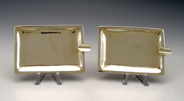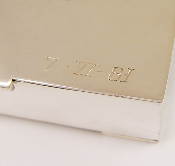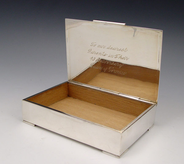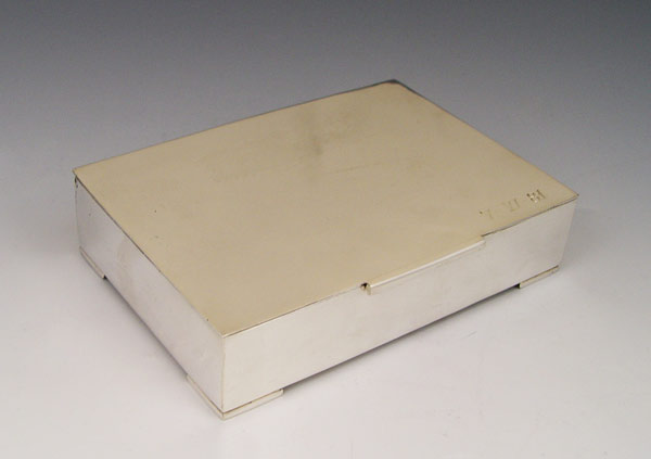 MEXICAN STERLING CIGARETTE BOX WITH 2 TRAYS: Marked A.G., Villa. Matching box and 2 ashtrays. Monogrammed with date outside and inscription inside. Wood lined box. Box measures 1 1/4'' x 5 1/2'' x 4''. Approx 15.2 troy oz, note weighed with wood inserts.