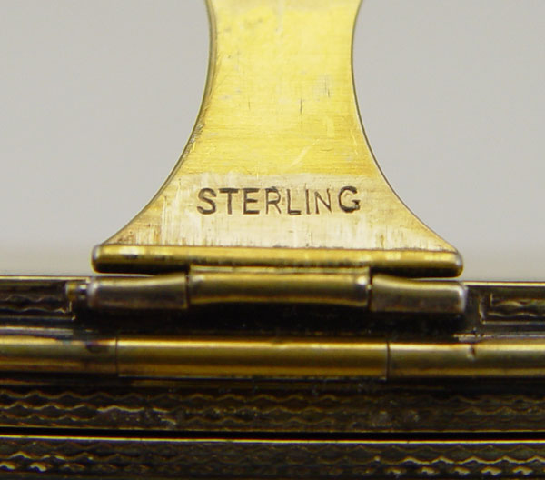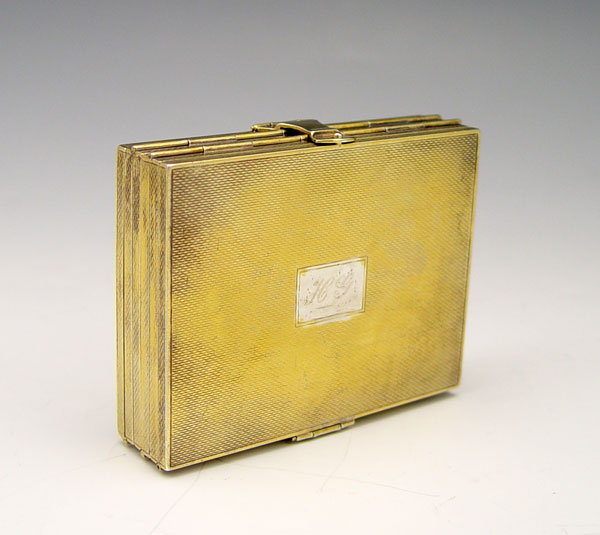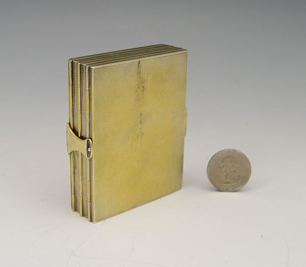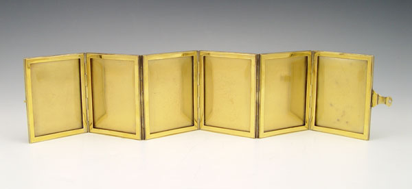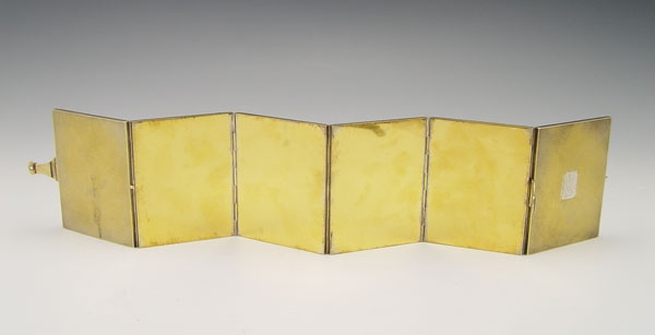 COLLAPSIBLE 6 FRAME STERLING PHOTO ALBUM: 6 frames hinged together with plastic inserts and gold wash overall. Simply marked sterling. Monogrammed. Closed measures 1'' x 3'' x 2 1/2''. Open 14'' long. Approx. 8.7 troy oz, weighed with plastic inserts.