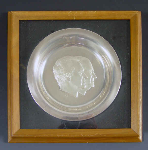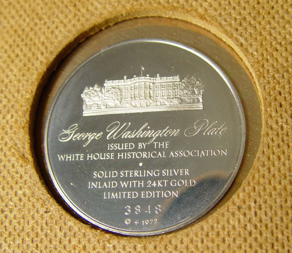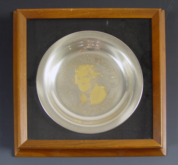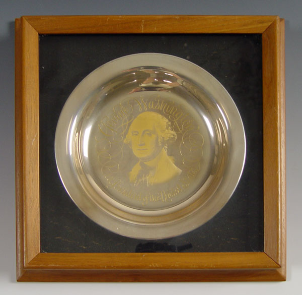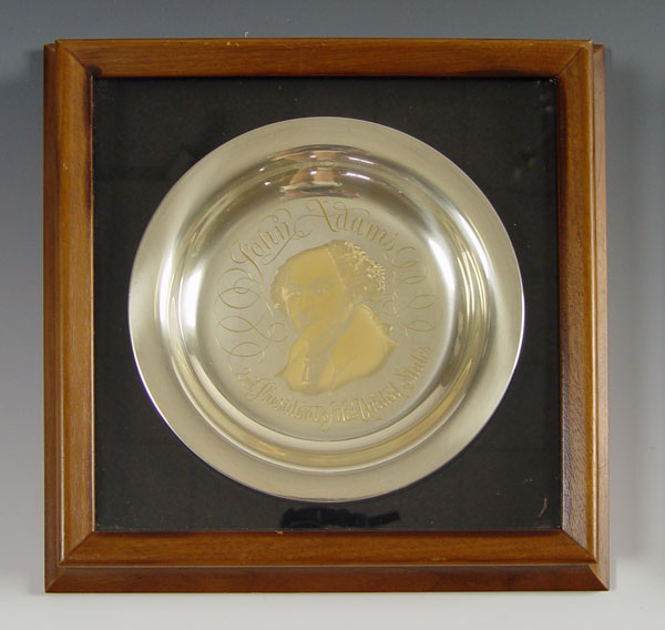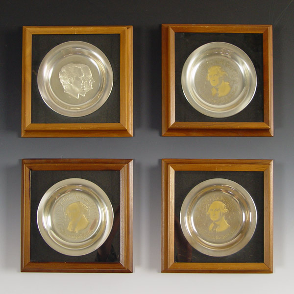 FOUR FRAMED PRESIDENTIAL STERLING PLATES: 3 are by the White House Historical Association including John Adams, Thomas Jefferson, George Washington. 1 is official 1973 Inauguration Committee Nixon/Agnew plate. Approx 31 troy oz. Each frame measures 12'' x 12''.