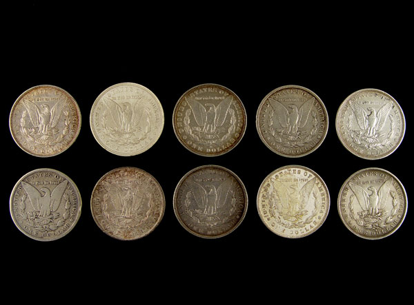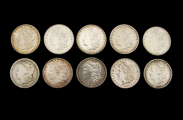 COLLECTION OF 10 MORGAN SILVER DOLLARS: Ungraded. Includes 1878, 1880 (note condition), 1880-S, 1884, 1885-S, 1888-O, 2 1890-S, 1899-O, 1921 (note finish). Approx. 8.5 troy oz.