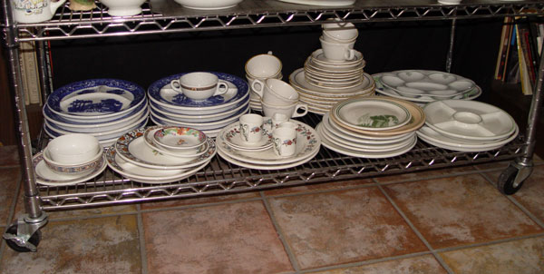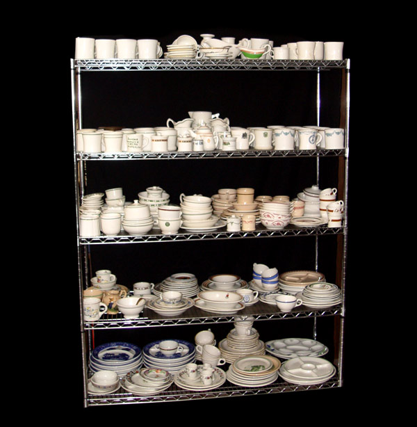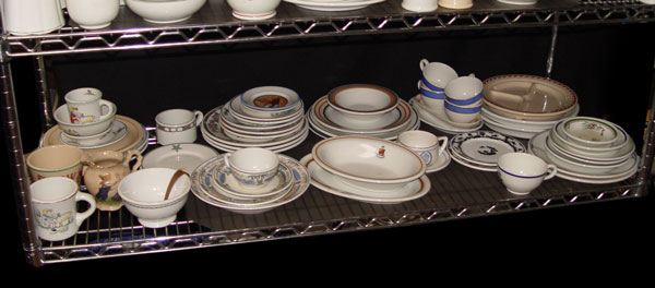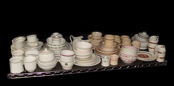 A GRAND COLLECTION OF HOTEL WARE BY WARWICK: 5 shelves full of heavy commercial grade vitrified clay hotel and banquet ware. Mugs, bowls, ashtrays, individual creamers, jugs, mustard pots, plates, platters and serving bowls. From the private collection of John Rader Sr., author of Warwick China.