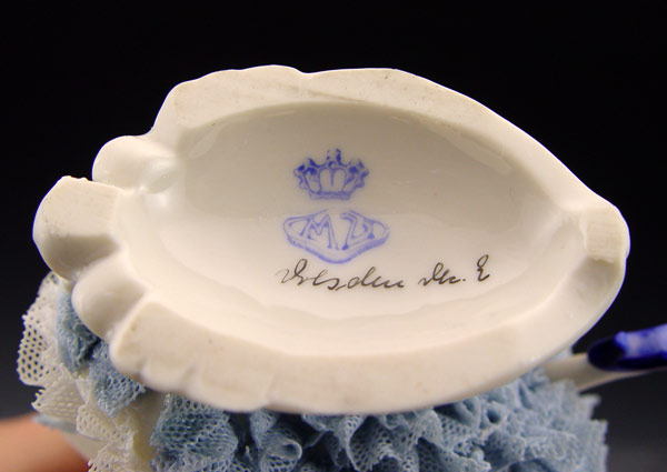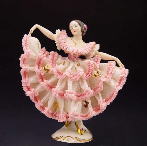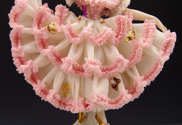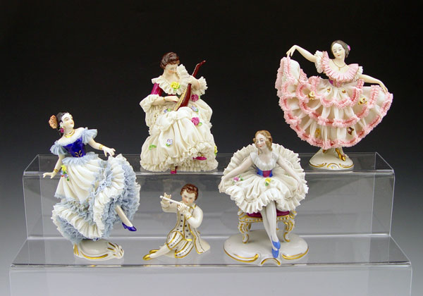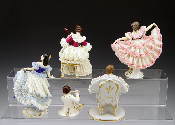 5 DRESDEN PORCELAIN FIGURINES: 4 lacy lady figures, 1 boy with flute. 3''- 6'' h.