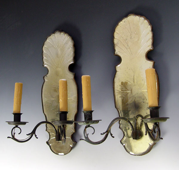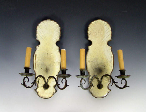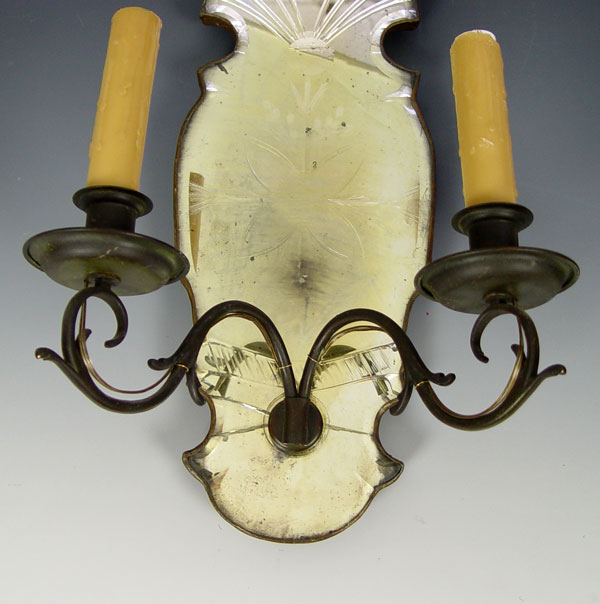 PAIR VENETIAN GLASS MIRRORED SCONCES: Electrified 2 light sconces with venetian mirror backs. Measures 18 1/2'' x 11 1/2'' x 7''.