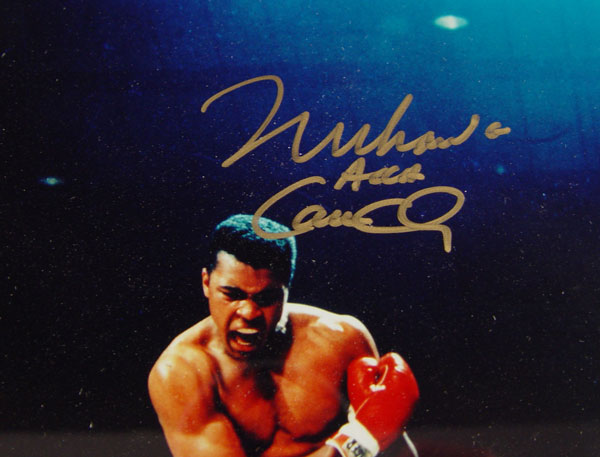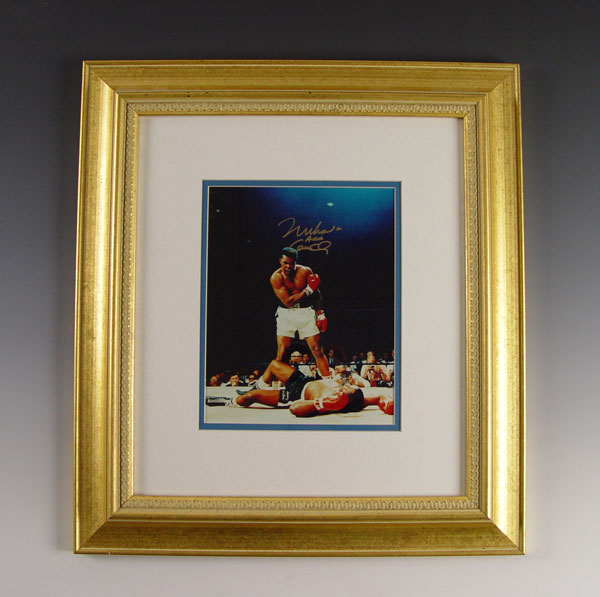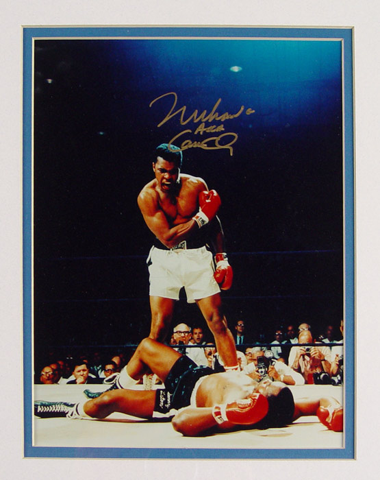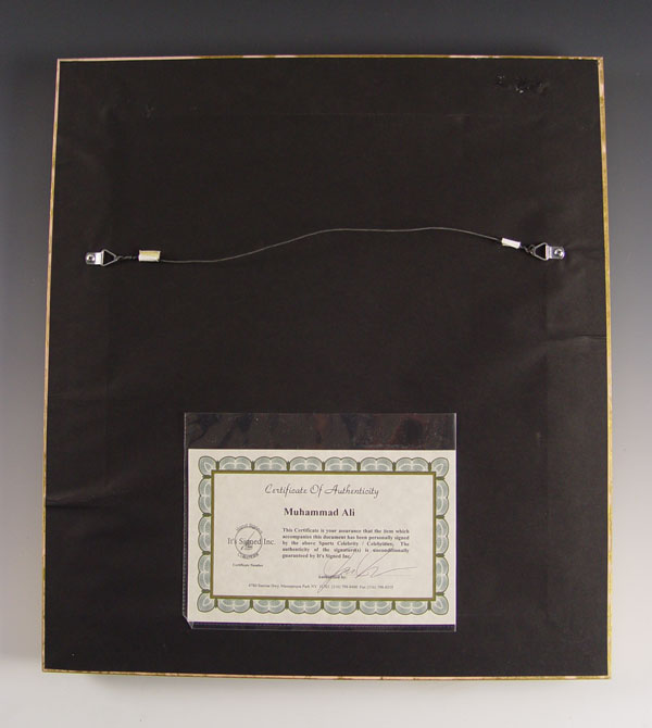 MUHAMMAD ALI SIGNED PHOTO: Image of Ali victorious in ring. Signed in gold. Comes with COA from It's Signed Inc. verso. Sight size 9 1/2'' x 7 1/2'', double matted and framed 20 1/2'' x 18 1/2''.